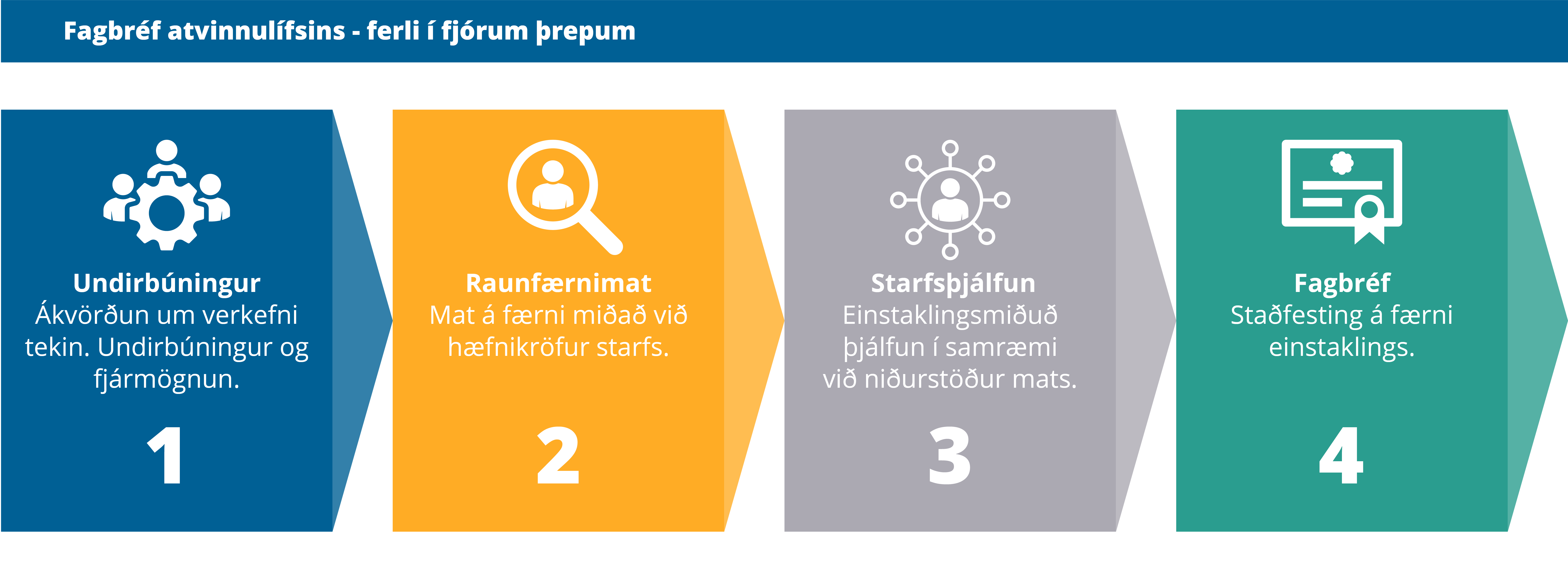 Námslok eru með Fagbréfi atvinnulífsins út frá tilteknu starfi sem fram kemur á útskriftarskírteini.Tiltölulega stór hluti námsins er vinnustaðanám undir leiðsögn starfsþjálfa á vinnustað. Með þessu námi fjölgar möguleikum til námsloka fyrir tiltekinn hluta markhóps framhaldsfræðslunnar sem hingað til hefur notið fárra valkosta í bæði náms- og starfstækifærum á fyrsta þrepi íslenska hæfnirammans um menntun.