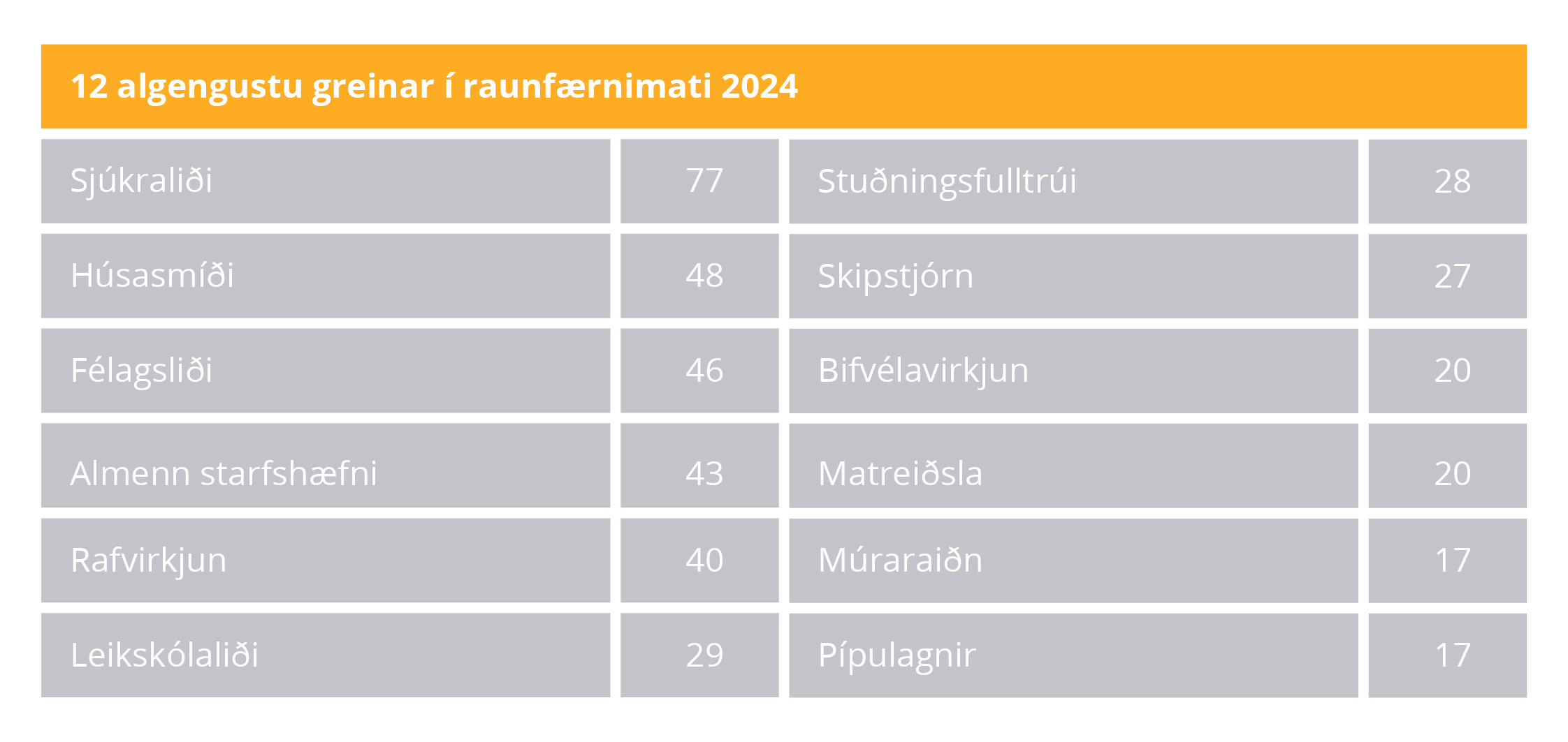 Flestir fóru í gegnum raunfærnimat á sjúkraliðabraut (77 manns), húsasmíði (48 manns), í félagsliða (46) og í Almennri starfshæfni (46). Raunfærni var metin á móti formlegu og óformlegu námi sem og viðmiðum starfa. Sífellt bætast ný svið við þar sem hægt er að fá reynslu af vinnumarkaði metna og vottaða í gegnum Fagbréfaleiðina.