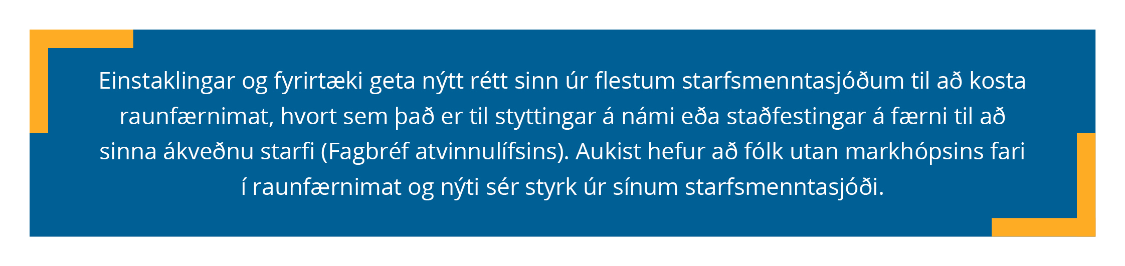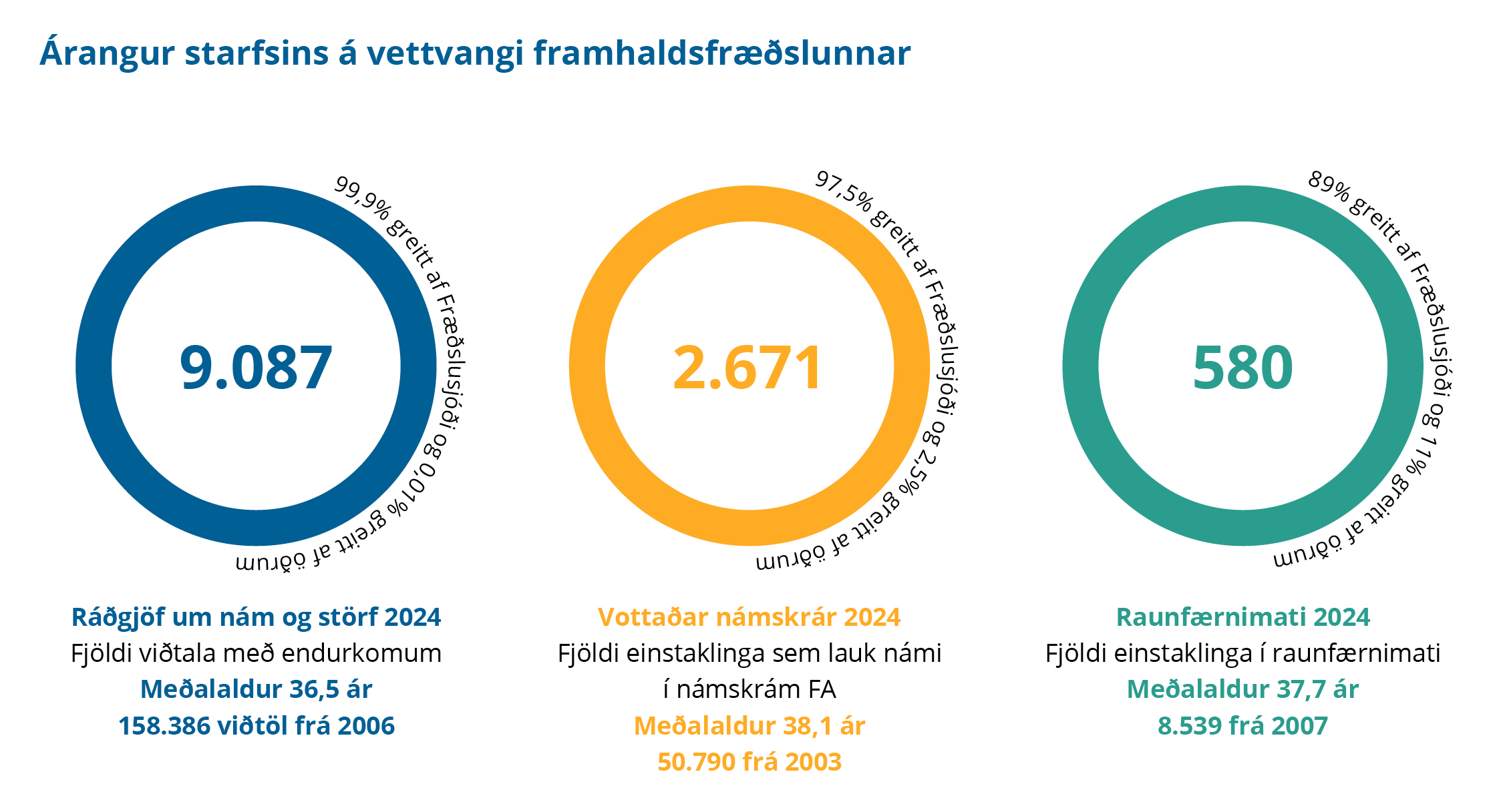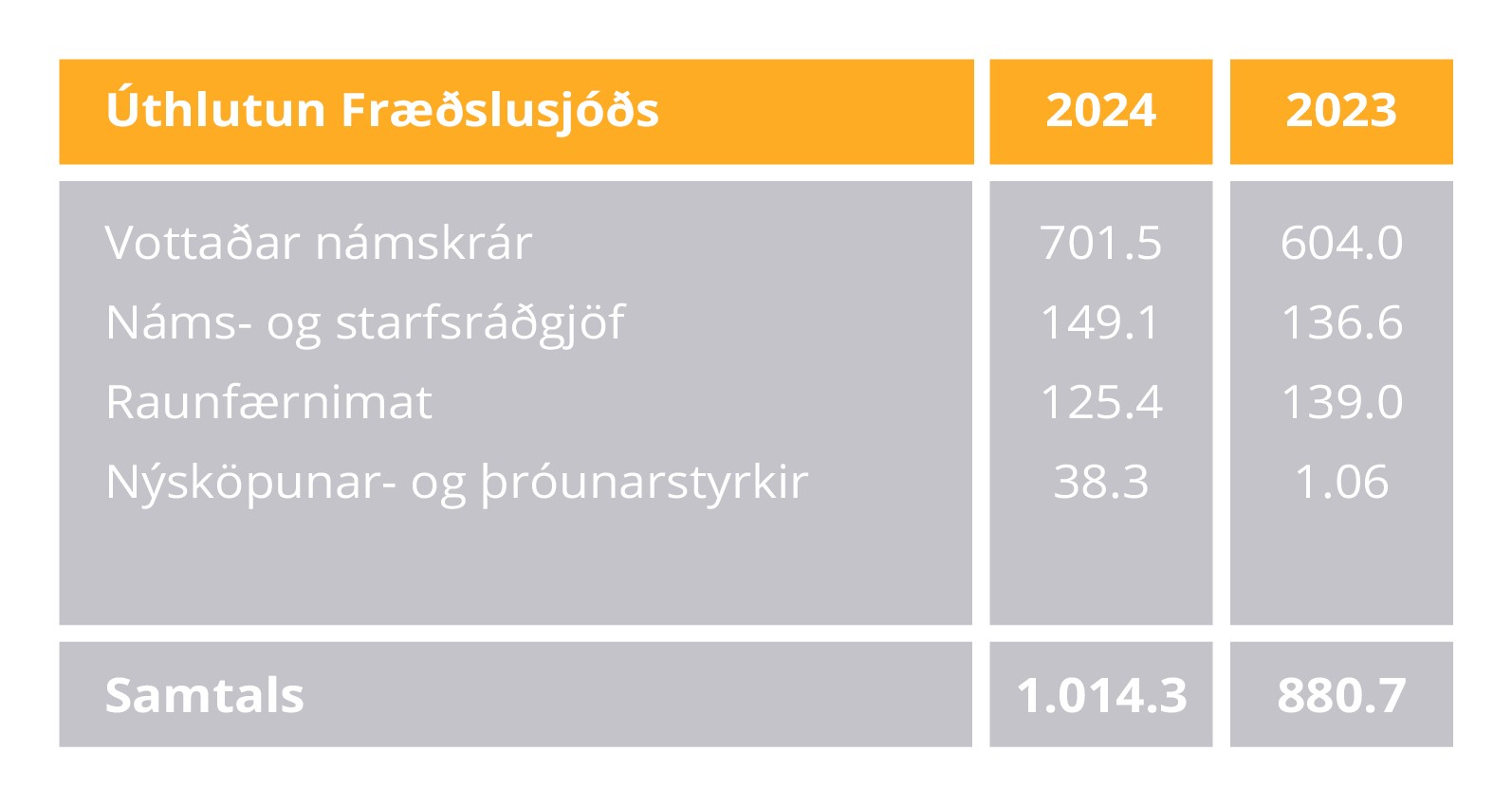 Á árinu 2024 var aukning í þátttöku í námi á vettvangi framhaldsfræðslunnar sem nemur 15,5%. Þátttaka í raunfærnimati var 10% minni og í ráðgjöfinni 4% minni miðað við árið 2023. Fjármagn Fræðslusjóðs var fullnýtt fyrir árið 2024. Ljóst er að sú ákvörðun Fræðslusjóðs um að opna á tilfærslu fjár á milli úhlutunarflokkanna þriggja; ráðgjafar, náms og raunfærnimats, leiðir til þess að fræðsluaðilar ná betur að mæta þörfum og aðstæðum á sínu svæði.