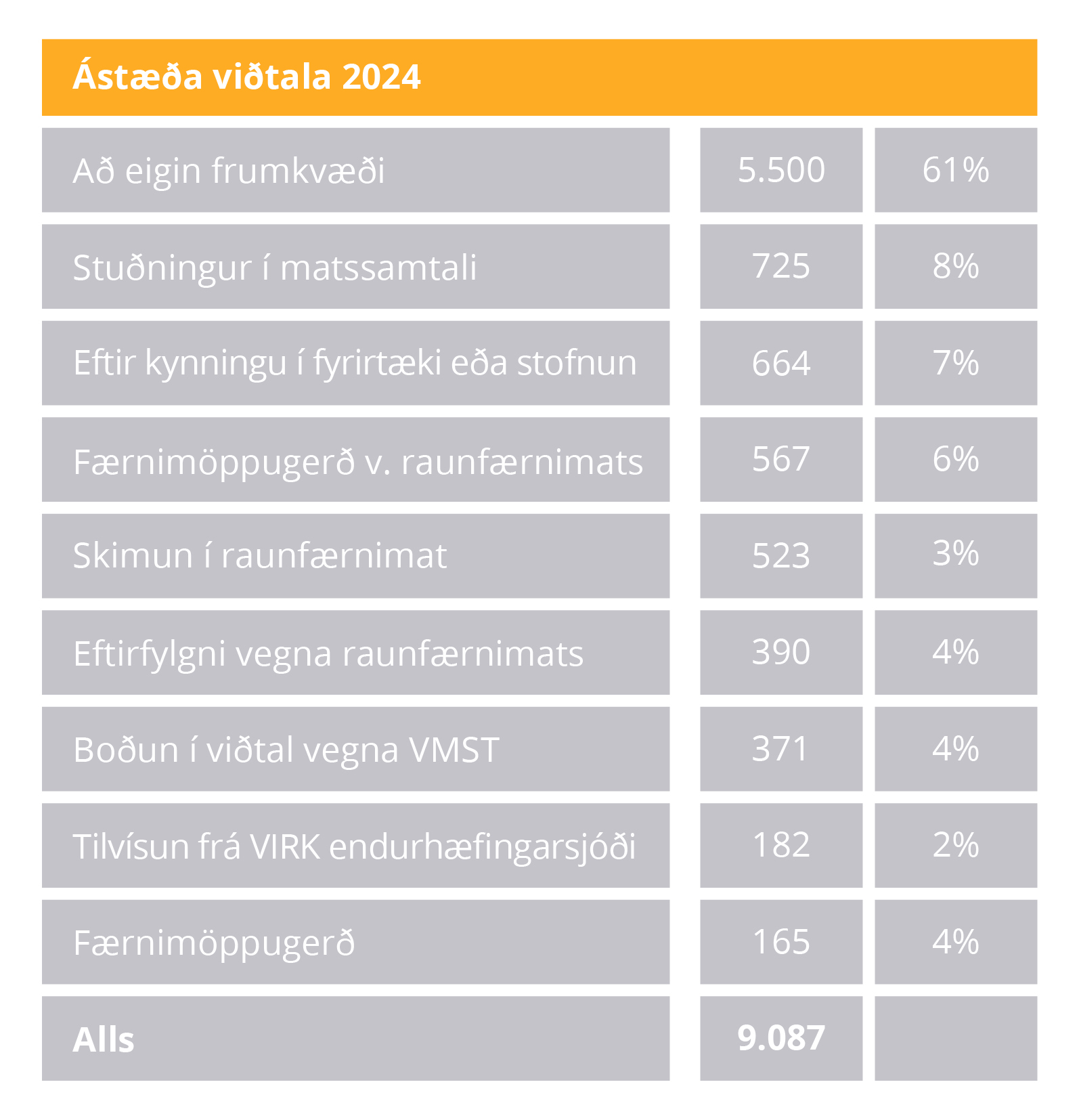 Algengasta inntak ráðgjafarviðtala tengist raunfærnimatsferlinu, eða um 24% viðtala. Á það við um skimunarviðtal þar sem fólk mátar sig við raunfærnimat í ákveðinni grein; færnimöppugerð, stuðning inni í matssamtali (valkvætt af hálfu þátttakanda) og viðtal að ferli loknu til að taka ákvörðun um næstu skref (eftirfylgniviðtal). Mikið er einnig um að fólk komi til að afla sér upplýsinga almennt um nám, afla sér upplýsinga um raunfærnimat og til að leita sér aðstoðar við ferilskrárgerð. Rúmur helmingur þeirra sem kom í viðtal á árinu gerði það að eigin frumkvæði (61%). Minna hefur verið um vinnustaðaheimsóknir af hálfu ráðgjafa undanfarin ár og meira um að ráðgjafarviðtölin séu setin fólki sem er í námi hjá fræðslu- og símenntunarmiðstöðvunum.