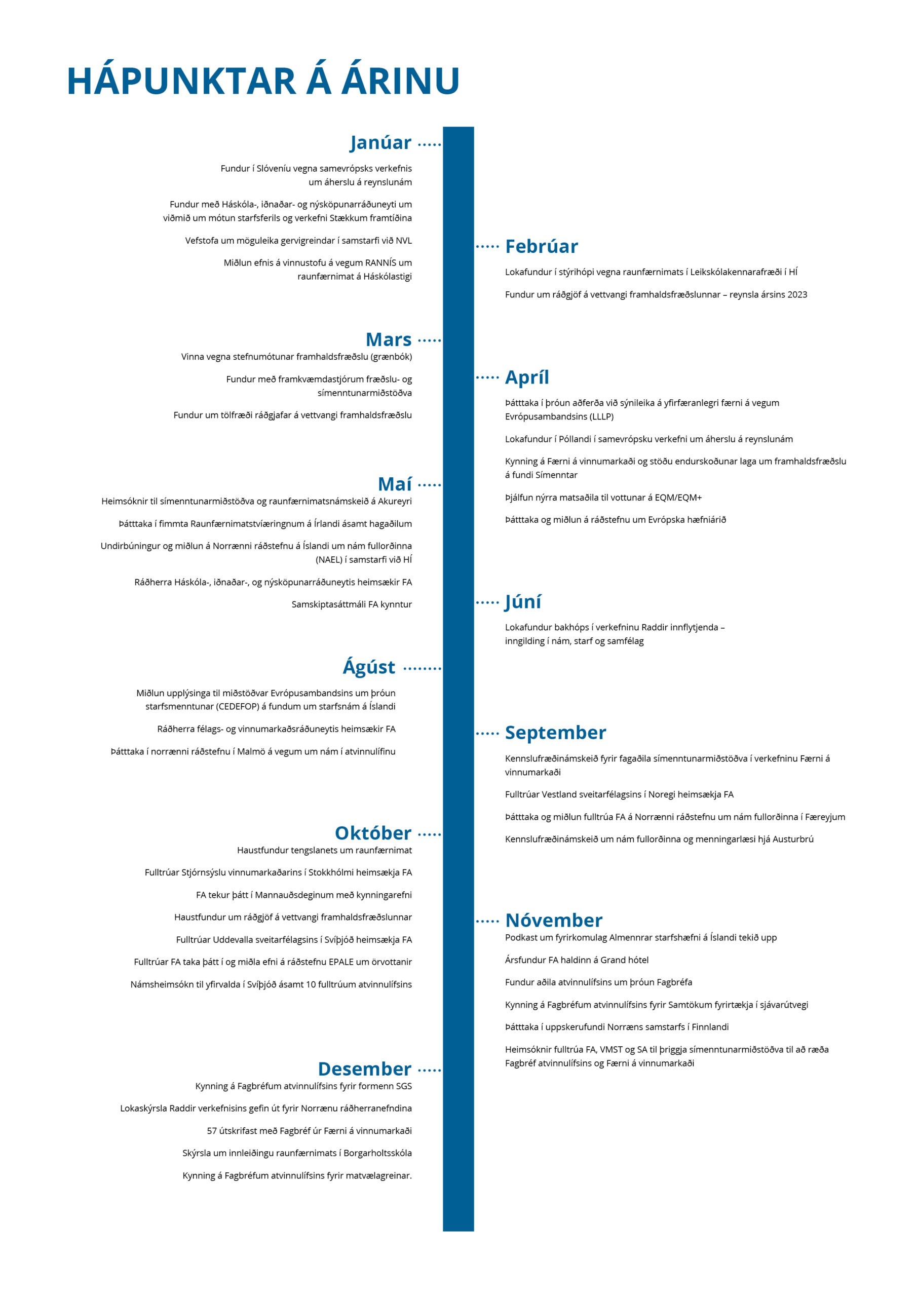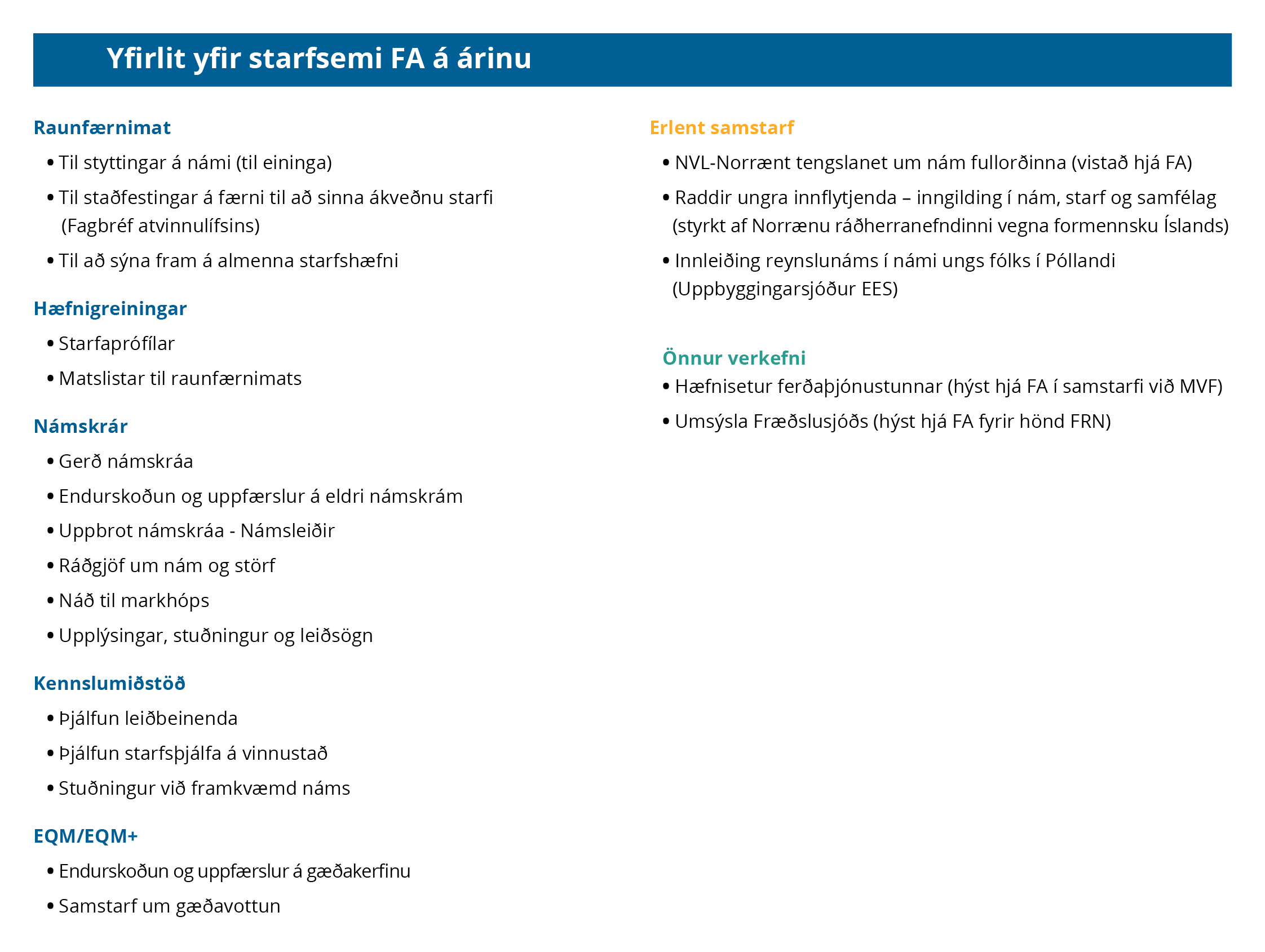 Á árinu vann FA að uppfærslu ferlis fyrir raunfærnimat í Almennri starfshæfni í samstarfi við leiðbeinendur og ráðgjafa af vettvangi. Unnið var að samræmingu vinnulags í ferlinu með því að ræða reynsluna og áskoranir og bera saman framkvæmd á svæðum. Afurð þessarar vinnu verður handbók um ferlið sem ætlað er að efla gæði og auðvelda framkvæmd. Raunfærnimat í Almennri starfshæfni er ferli þar sem einstaklingar fá handleiðslu við að meta færni sína á móti hæfniviðmiðum á hæfniþrepum í tengslum við íslenska hæfnirammann um menntun. Hæfniviðmiðin voru valin af aðilum atvinnulífsins ásamt sérfræðingum FA og eru í grunninn viðmið sem þörf er á í öllum störfum á vinnumarkaði og þar með yfirfæranleg á milli starfa. Ferlinu líkur alltaf með matssamtali og fær þátttakandi niðurstöður sem sýna metna hæfniþætti í hendur ásamt samtali um áframhaldandi færniþróun.