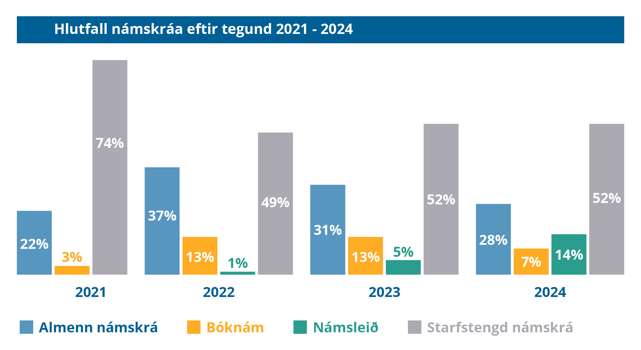 Þegar skoðað er hverskonar nám fólk sækir helst í út frá fjölda nemenda sést á töflunni hér fyrir ofan að mest er sótt í starfstengt nám (í formi námskráa eða námsleiða) en hlutfallslega lítið er sótt í nám sem er eingöngu bóklegt.