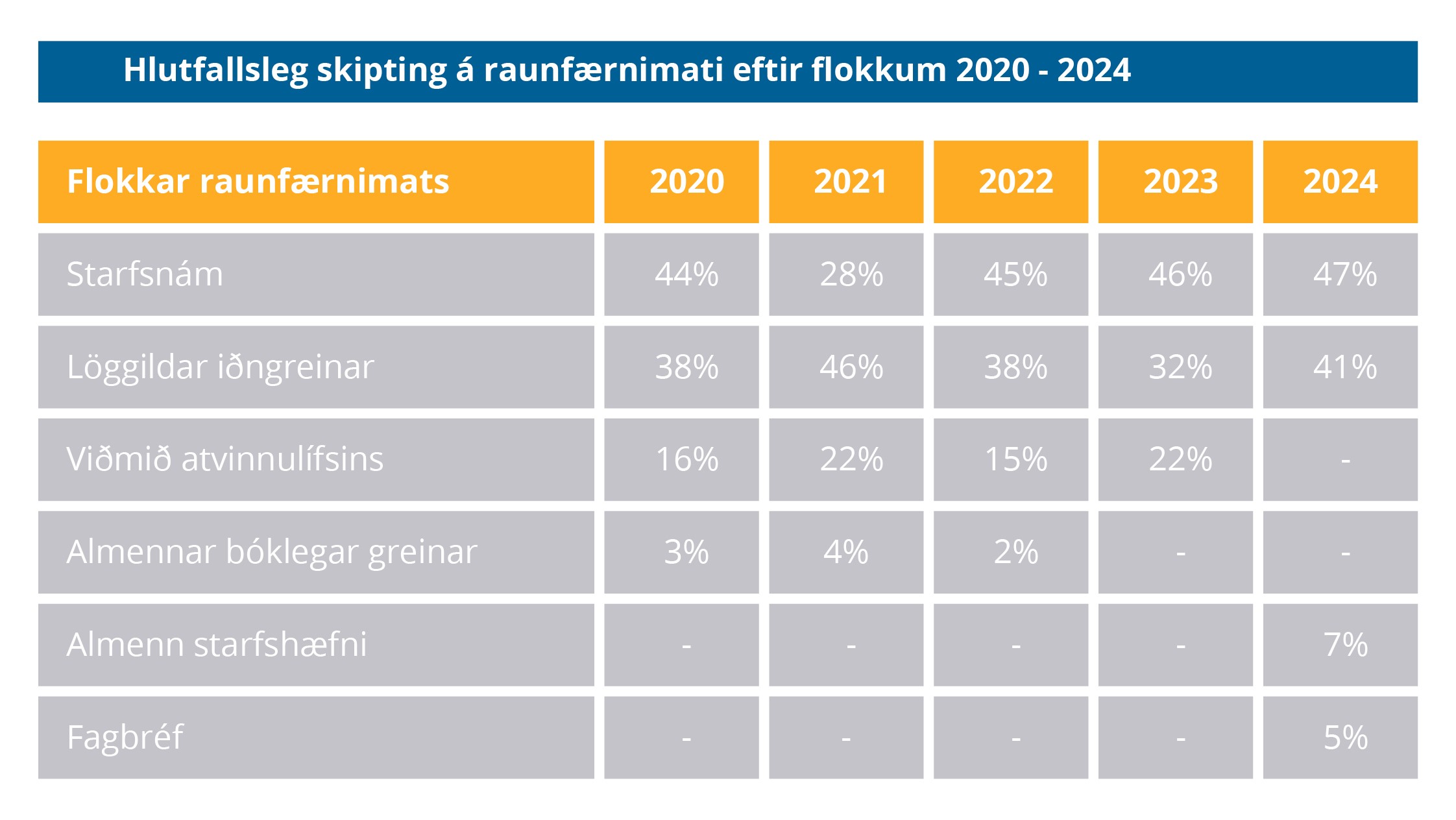 Ef tekið er meðaltal síðustu fimm ára má sjá að hlutfall þátttakenda í raunfærnimati á starfsnámsbrautum og þátttakenda í raunfærnimati í iðngreinum sem lýkur með sveinsprófi hefur jafnast.