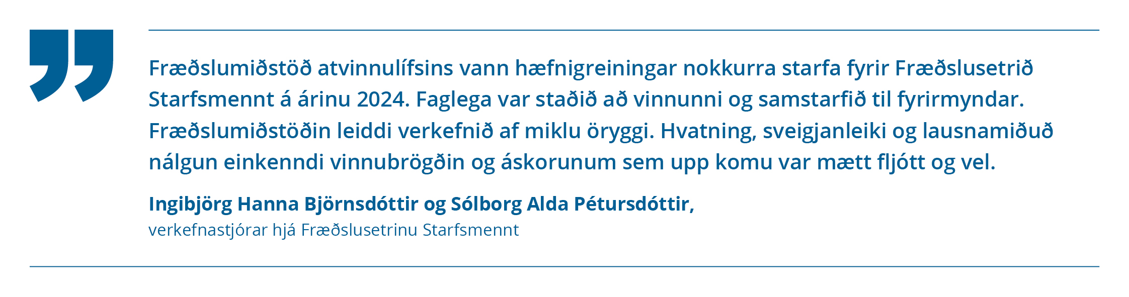 Það er mér bæði ljúft og skylt að þakka starfsfólki Fræðslumiðstöðvar atvinnulífsins fyrir faglegt, metnaðarfullt og hugmyndaríkt starf á árinu 2024. Verkefnin hafa verið mörg og fjölbreytt, en undir liggur skýr stefna: að byggja upp öflugan, sanngjarnan og sveigjanlegan vinnumarkað þar sem hæfni hvers og eins fær að njóta sín.