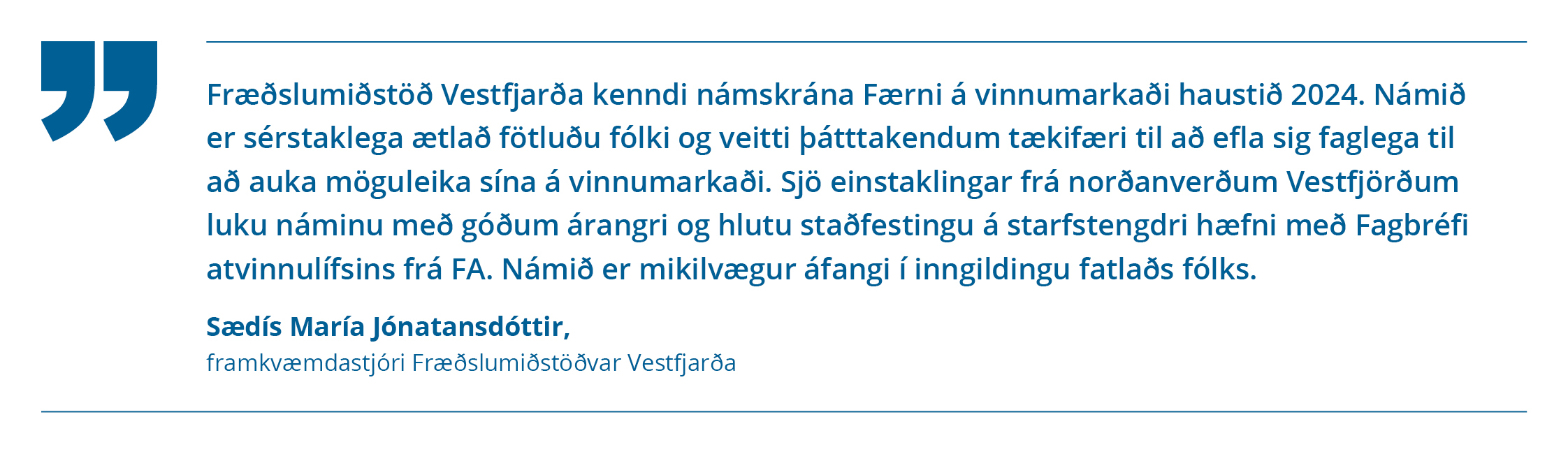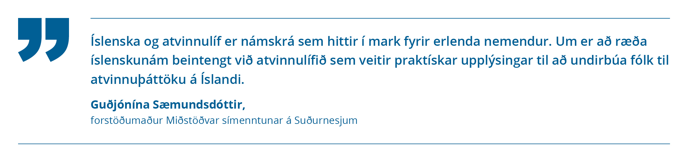 Fjöldi erlendra ríkisborgara sem sækja nám til símenntunarmiðstöðva hefur vaxið jafnt og þétt, sem endurspeglar fjölbreytileika og alþjóðavæðingu íslensks vinnumarkaðar. FA er stolt af því að geta boðið upp á nám sem mætir þörfum þessa hóps og stuðlar að betri aðlögun og þátttöku í samfélaginu. Á síðustu fimm árum hefur erlendum ríkisborgurum sem sækja nám hjá símenntunarmiðstöðvum víðsvegar um landið fjölgað úr 25% í 51%. Ljóst er að breytingin sem Fræðslusjóður samþykkti varðandi uppbrot námskráa FA, skilar því markmiði sem lagt var upp með. Ein slík námsleið Íslenska og atvinnulíf var mest sótta námið á árinu.