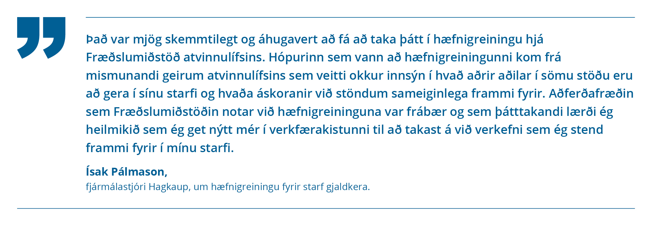 Afurð hæfnigreiningar er starfaprófíll sem er grunnur að uppbyggingu náms eða matslista fyrir raunfærnimat . FA hefur þýtt og aðlagað hæfnigreiningarferlið að aðstæðum á íslenskum vinnumarkaði.