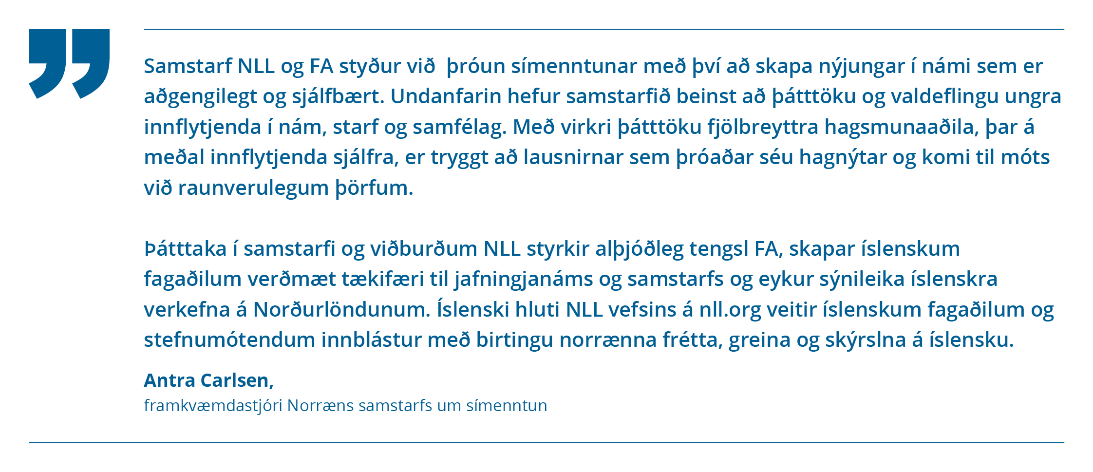 Verkefnið var hluti af formennsku Íslands í Norrænu ráðherranefndinni (2023) og var unnið í samstarfi við Norrænt tengslanet um nám fullorðinna (NVL), félags- og vinnumarkaðsráðuneytið, mennta- og barnamálaráðuneytið auk fjölda haghafa í málaflokknum.