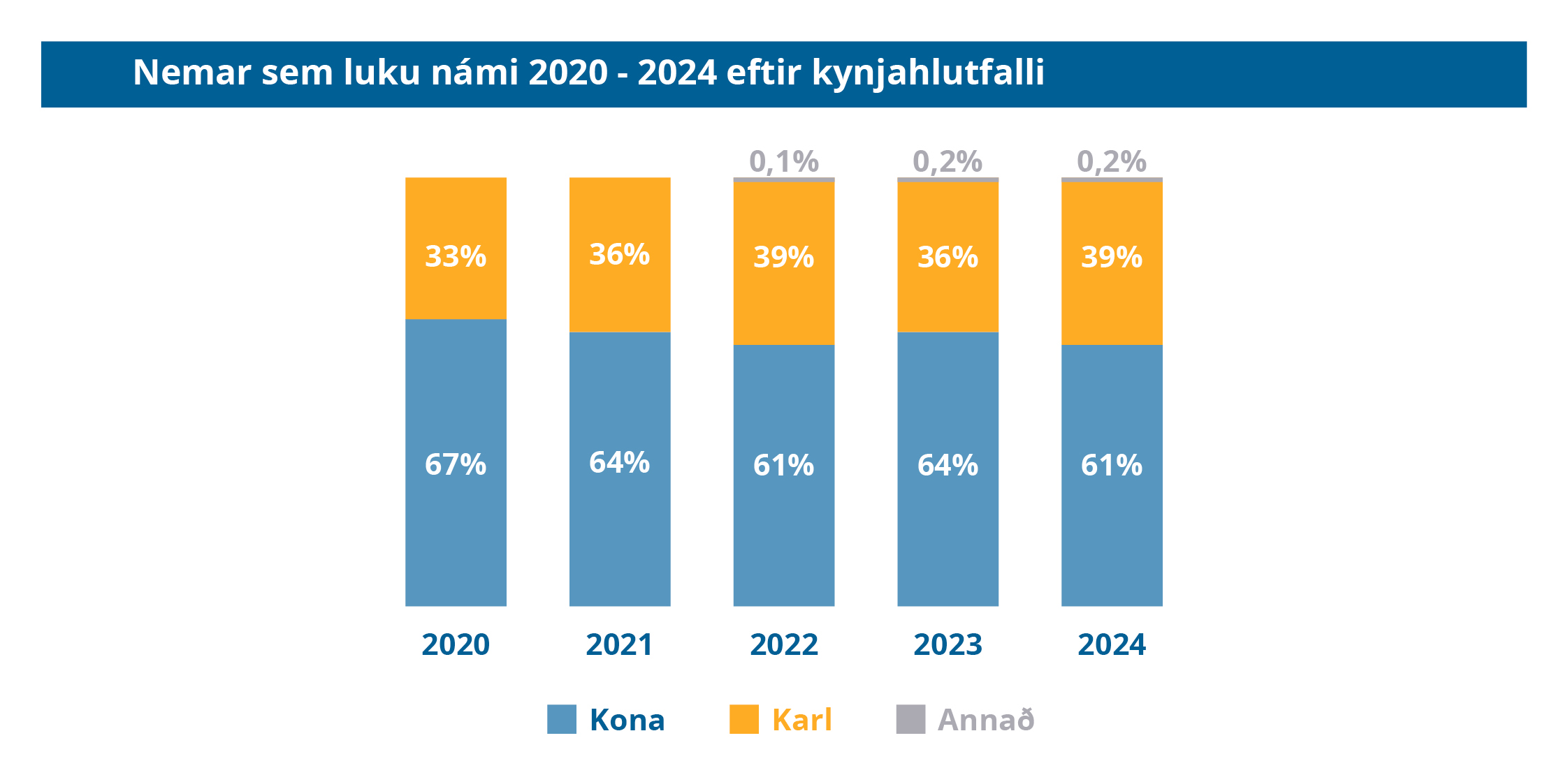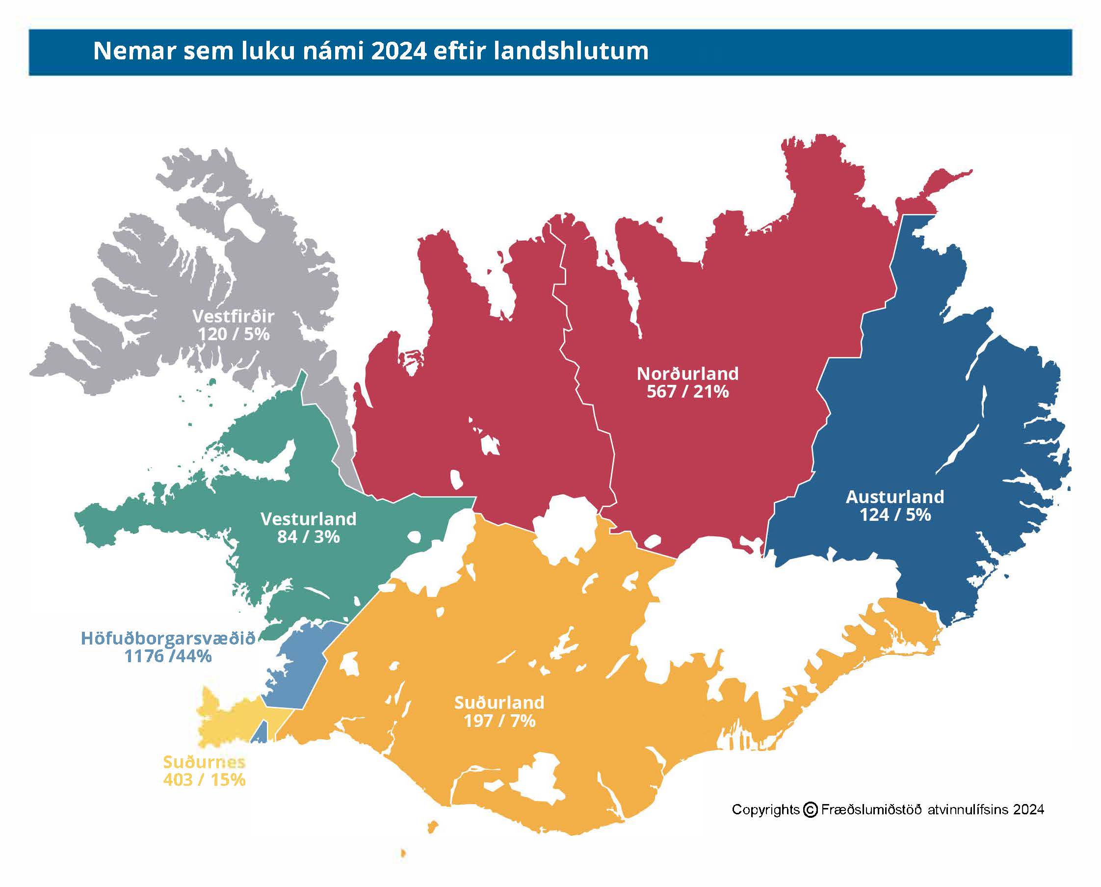 Alls luku 2671 einstaklingur námi út frá námskrám og námsleiðum FA á árinu 2024. Það er fjölgun frá árinu á undan þegar 2261 einstaklingur lauk námi. Meirihluti þeirra sem luku námi árið 2024 eru konur eða 61% sem er svipað hlutfall kynja í námi innan framhaldsfræðslu og undanfarin ár.