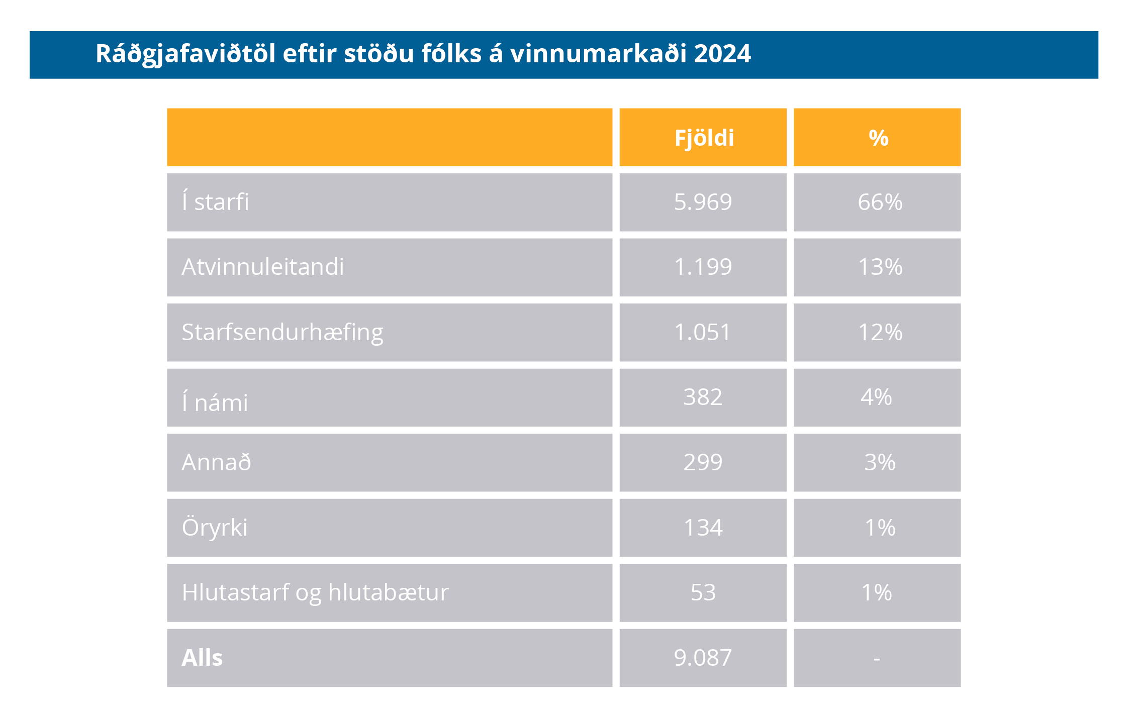 Ráðgjöfinni er ætlað að ná til markhópsins með upplýsingar og hvatningu til símenntunar. Fjöldi ráðgjafarviðtala á árinu með endurkomum var 9.087. Heildarfjöldi einstaklinga var 4454, sem gefur til kynna að flestir eru að koma í tvö viðtöl eða fleiri. Mestur er fjöldi viðtala hjá IÐUNNI fræðslusetri, Mími-símenntun og Framvegis. Af þeim sem komu í ráðgjöf eru langflest í starfi eða 66%, 13% eru í atvinnuleit, 12% í starfsendurhæfingu og 4% í námi. Flestir atvinnuleitendur í ráðgjöf voru á Suðurnesjum, Vesturlandi og á Vestfjörðum líkt og árið áður.