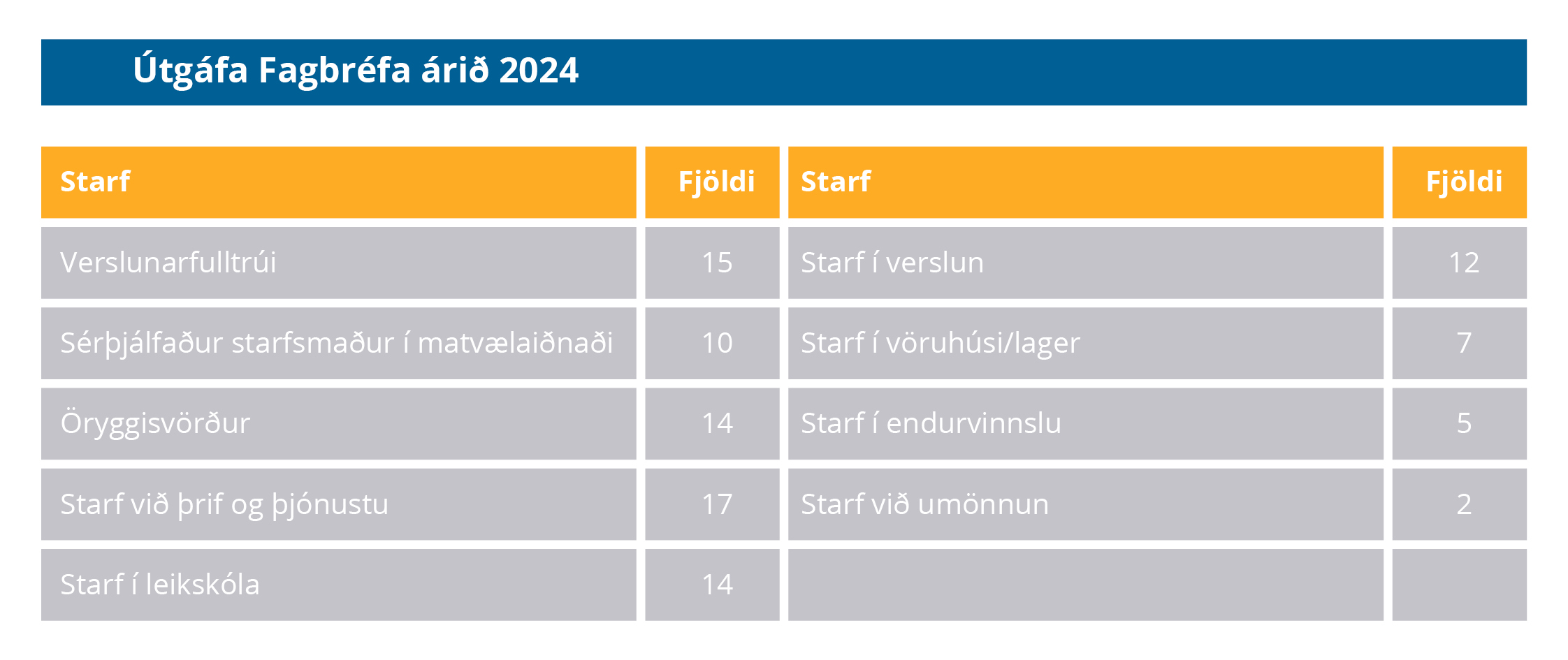 Á árinu voru gefin út 96 Fagbréf. Af þeim voru 57 hluti af námskránni Smiðja 1-2,2 (Færni á vinnumarkaði) og er inni í tölfræðinni undir kaflanum um námskrár.