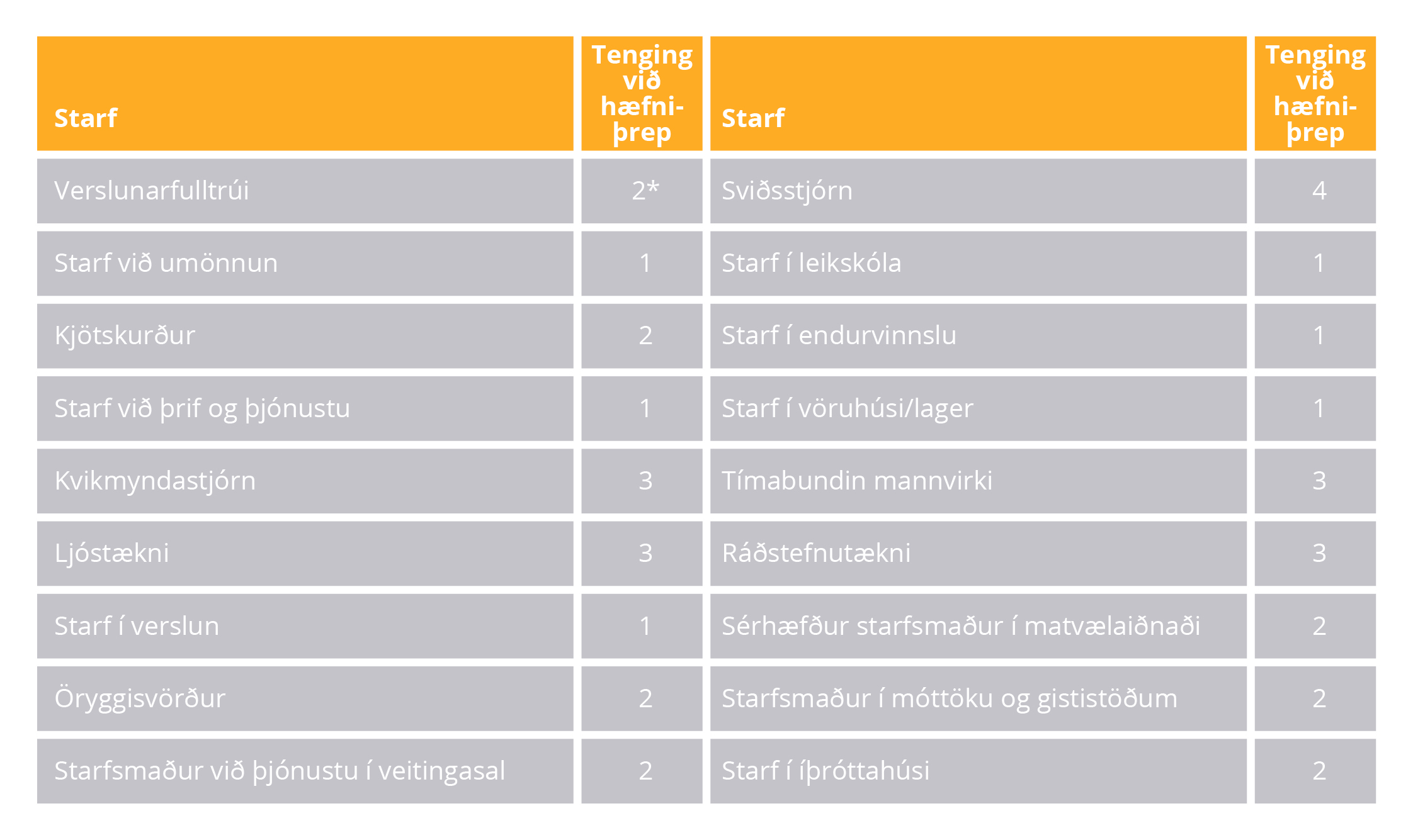 Í eftirtöldum störfum er hægt að framkvæma og gefa út Fagbréf atvinnulífsins. Fyrir þau er búið að hæfnigreina starf, vinna starfaprófíl, matslista og þjálfa matsaðila til að framkvæma raunfærnimat innan ferlisins.